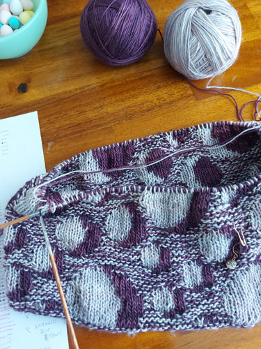 最近編み終わったのは "Hypatia" と言う名の月の模様のカウル、デザイナーは Carissa Browning さんです。ポンポンマガジンのE-bookを買いました。初めてダブルニッティングと言うやり方を知りました。2色の糸を使って編み、出来上がるとカウルをひっくり返すと同じ模様が全く反対の色で出来上がっています。白っぽい三日月の面と、紫の三日月の面ができるのです。ちょっと感動しました。今まで編んできた模様編みは、裏面は糸が通っていて、裏面を見せて着るというのはそういうデザインでない限りしないけれど、これは完全にリバーシブルです。どんなふうになるのか見てみたくて挑戦したものだけれど、これでブランケットとか編んだらいいだろうなぁ、欲を言えば全部同じ三日月でなくて、月の満ち欠けがいろんなステージになってパターンに出ていたらもっと素敵だろうなぁ。。と思いながら、いつかブランケット、この方法を使って編んでみたい、かもしれないです。